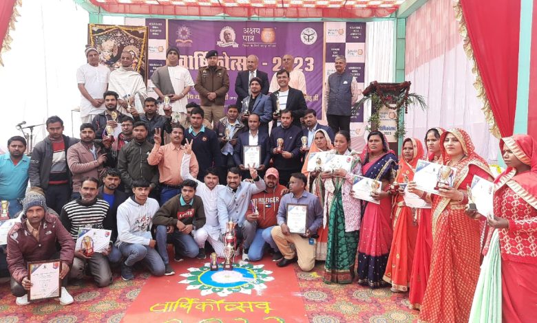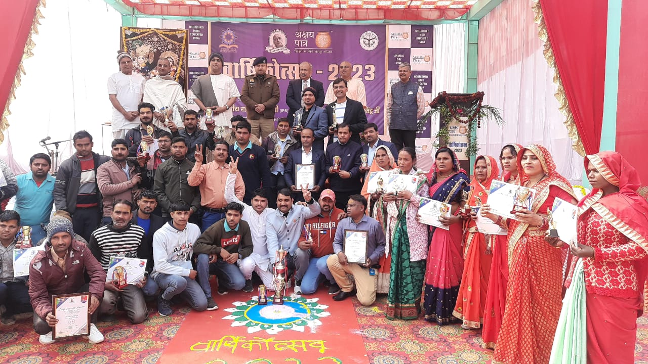 वृन्दावन/मथुरा।अक्षय पात्र फाउण्डेशन द्वारा गुरूवार को वृन्दावन में वार्षिकोत्सव का आयोजन किया गया। कार्यक्रम की अध्यक्षता कर रहे, अपर पुलिस महानिदेशक श्री राजीव कृष्ण जी ने कहा कि अक्षय पात्र आज देश में सेवा का पर्याय बना हुआ है। इसके द्वारा परिषदीय विद्यालयों के छात्रों को शुद्ध, पौष्टिक, एवं उच्च गुणवत्ता युक्त गरमा-गरम भोजन उपलब्ध कराया जाता है। यह एक अद्भुत सेवा है।कार्यक्रम का शुभारंभ मुख्य अतिथि अपर पुलिस महानिदेशक आगरा जोन, श्री राजीव कृष्ण जी, वरिष्ठ पुलिस अधीक्षक (आईपीएस) शैलेश पाण्डेय जी , गोवर्धन विधायक श्री मेघश्याम जी, अक्षय पात्र के श्री अनंतवीर्य दास जी, श्री सुरेश्वर दास जी द्वारा दीप प्रज्जवलित कर किया गया।कार्यक्रम के विशिष्ठ अतिथि गोवर्धन विधायक मेघश्याम सिंह ने कहा कि संस्था द्वारा ब्रज में अद्वितीय सेवा के कार्य किये जा रहे हैं। वहीं वरिष्ठ पुलिस अधीक्षक शैलेश पाण्डेय जी ने कहा कि संस्था द्वारा की जा रही, यह एक बडी़ एवं निस्वार्थ सेवा है। उन्होंने कहा कि संस्था द्वारा समाज के सभी वर्गों के लिए सेवा कार्य अनवरत चलते रहते हैं। इन सेवा कार्योें के लिए उन्होंने संस्था की खुले दिल से सराहना की।संस्था का परिचय देते हुए श्री सुरेश्वर दास जी ने बताया कि बैगलोर से सन् 2000 में पाँच शासकीय विद्यालयों के 1500 छात्रों को मध्याह्न भोजन उपलब्ध कराने वाली सेवा, आज वित्रित रूप में भारत के 14 राज्यों एवं दो केन्द्र शासित प्रदेश के 22,367 विद्यालयों के लगभग 20 लाख छात्रों को प्रतिदिन मध्याह्न भोजन उपलब्ध करा रही है। हमारा लक्ष्य है कि हम वर्ष 2025 तक प्रतिदिन 30 लाख छात्रों तक शुद्ध एवं पौष्टिक मध्याह्न भोजन उपलब्ध करा सकें।इस अवसर पर संस्था द्वारा आयोजित विभिन्न खेल स्पर्धाओं रस्सा कसी, वालीबाॅल, क्रिकेट, बैडमिंटन आदि के विजेताओं का पुरस्कार वितरण किया गया। इसके पश्चात संस्था में सेवा के दौरान सर्वश्रेष्ठ प्रदर्शन करने के लिए विष्णु सिंह, मुकेश अग्रवाल, विजय कुमार, विजय शंकर तिवारी, उमाशंकर, अमरेश सिह, योगेन्द्र कमल सिंह, मनीष सिंह को शील्ड प्रदान कर पुरस्कृत किया गया।