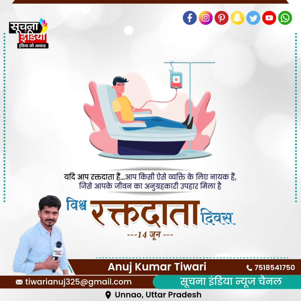 लोगों में रक्तदान करने के प्रति जागरूकता बढ़ाने के लिए हर साल 14 जून को विश्व रक्तदाता दिवस मनाया जाता है ब्लड डोनेशन एक दर्द रहित क्रिया है जो किसी जरूरतमंद की जिंदगी बचा सकती है विश्व भर में इस दिन को मनाने का मकसद सभी को रक्तदान करने के लिए प्रोत्साहित करना है ताकि अधिक लोगों की जान बचाई जा सके।