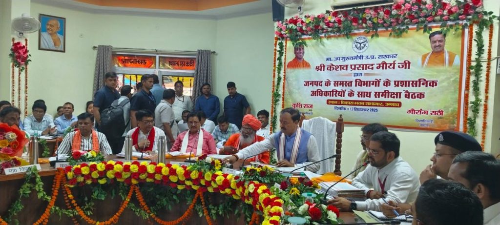 उपमुख्यमंत्री केशव प्रसाद मौर्य ने आज उन्नाव में विकास कार्यों की समीक्षा कर सरकार की कल्याणकारी योजनाओं का लाभ पात्रों तक पहुंचाने के निर्देश दिया। उपमुख्यमंत्री ने मिड डे मील में मशरूम दिए जाने, निर्विवाद उत्तराधिकार में जनपद नंबर वन होने, पैमाइश का कोई भी पुराना केस लंबित न होने पर, जिलाधिकारी उन्नाव की सराहना कर बधाई दिया। उप मुख्यमंत्री ने दिव्यांग जनो को ट्राईसाइकिल देकर समूहो की दीदियो को प्रशस्ति पत्र, वितरित किये। आज उत्तर प्रदेश के उपमुख्यमंत्री केशव प्रसाद मौर्य ने जनपद में पहुंच कर विकास भवन सभागार में जनपद के प्रशासनिक अधिकारियों के साथ विकास कार्यों की समीक्षा की।