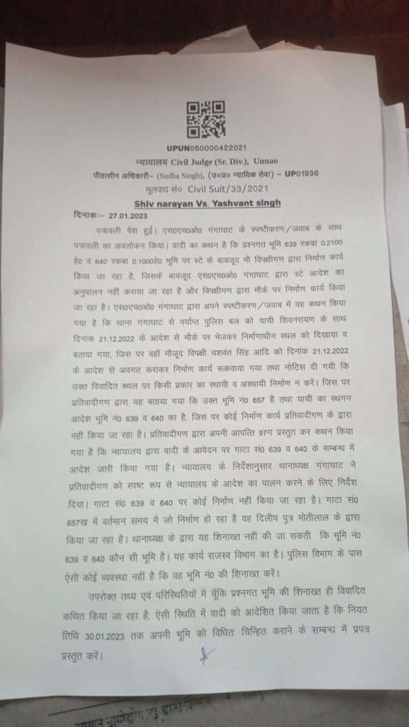 जबकि ये दोनों चालबाज पैसा वसूली के लिए जमीन संख्या 657 ख पर चल रहे निर्माण कार्य को अवैध बताकर इसे रूकवाने का काम करते है, आज गाटा संख्या 657 ख के वादी यशवंत सिंह की एक याचिका पर सुनावाई करते हुए कोर्ट ने कोतवाल को तलब कर प्रश्नगत भूमि पर 30.01.2023 तक विधितः चिन्हित कराने के संबंध में आदेश जारी कर दिया है।