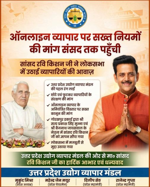 उत्तर प्रदेश उद्योग व्यापार मंडल की पहल पर स्थानीय छोटे और फुटकर व्यापारियों के हितों की रक्षा के लिए एक बड़ी कामयाबी मिली है। प्रदेश के समस्त जनपदों में ऑनलाइन व्यापार के अनियंत्रित विस्तार से प्रभावित हो रहे व्यापारियों की समस्याओं को लेकर उत्तर प्रदेश उद्योग व्यापार मंडल द्वारा चलाए गए अभियान के अंतर्गत, गोरखपुर के लोकप्रिय सांसद श्री रवि किशन जी ने इस गंभीर विषय को देश की सबसे बड़ी पंचायत, लोकसभा में प्रमुखता से उठाया है।