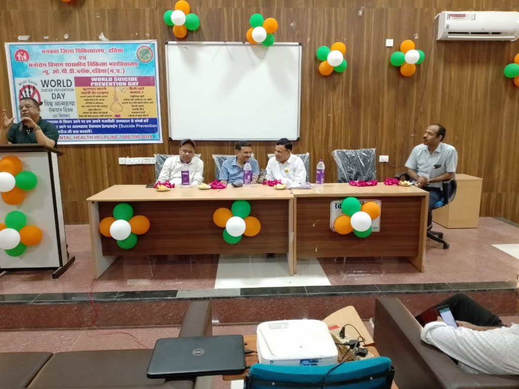 प्रस्तावना सम्बोधन विभागाध्यक्ष डाॅ कपिल देव आर्य के द्वारा दिया गया जिसमे आज के दौर मे आत्महत्या से जुडे मानसिक पक्ष तथा उनके समुचित उपचार की भूमिका साझा की।कार्यक्रम के मुख्य अतिथि सीएमएचओ डॉ कुरेले , विशिष्ठ अतिथि के रूप मे डॉ अर्जुन सिंह मेडिकल अधीक्षक, डाॅ के सी राठौर सिविल सर्जन, डाॅ के एम वरूण आर एम ओ वरिष्ठ चिकित्सक व मरीज के परिजन, एमबीबीएस छात्र, नर्सिंग स्टाफ उपस्थित हुए। डाॅ अर्जित ने आत्महत्या रोकथाम पर अपना प्रेजेंटेशन दिया । डाॅ अजब सिंह ने आभार माना।कार्यक्रम का संचालन डॉ माखन शाक्य ने किया ।