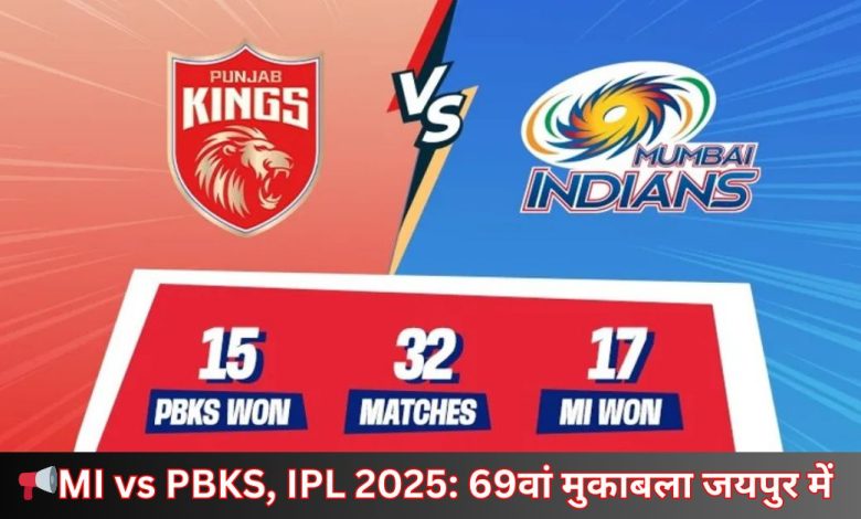 MI vs PBKS, IPL 2025: 69वां मुकाबला जयपुर में | Live Score, Head-to-Head, प्लेइंग XI
