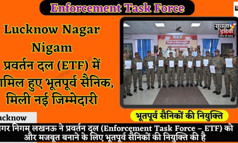 लखनऊ। नगर निगम लखनऊ ने प्रवर्तन दल (Enforcement Task Force – ETF) को और मजबूत बनाने के लिए भूतपूर्व सैनिकों की नियुक्ति की है। शुक्रवार को आयोजित एक कार्यक्रम में 4 JCO और 7 NCO/OR स्तर के सैनिकों को नियुक्ति पत्र सौंपे गए।
