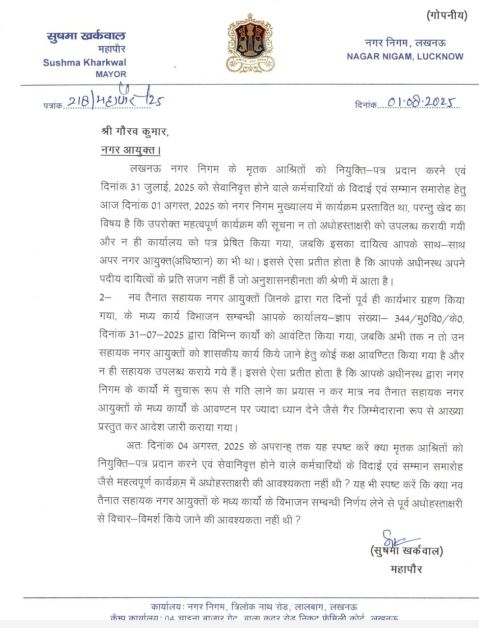 नगर निगम लखनऊ में आयोजित मृतक आश्रित नियुक्ति पत्र वितरण और सेवानिवृत्त कर्मचारियों के सम्मान समारोह को लेकर महापौर सुषमा खर्कवाल ने नगर आयुक्त गौरव कुमार को कड़ा पत्र भेजकर अपनी तीखी नाराज़गी जाहिर की है।