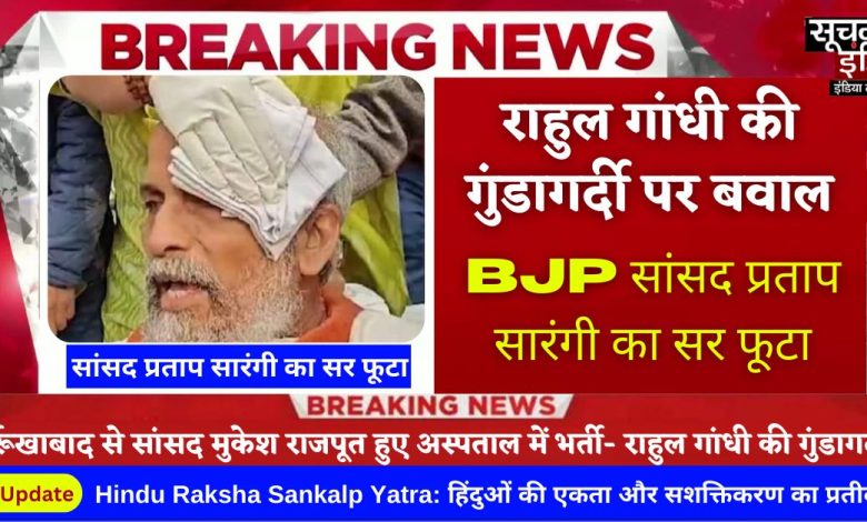 बीजेपी सांसद प्रताप चंद्र सारंगी ने आरोप लगाया कि कांग्रेस नेता राहुल गांधी ने उन्हें धक्का दिया, जिससे वह सीढ़ियों से गिर गए और उनके सिर पर गंभीर चोट आई। सारंगी ने कहा कि जब वह सीढ़ियों पर खड़े थे, एक अन्य सांसद जिसे राहुल गांधी ने धक्का दिया जिससे वह उनके ऊपर गिरा, और इससे उन्हें चोट लगी। इस हादसे के बाद उन्हें इलाज के लिए अस्पताल ले जाया गया।