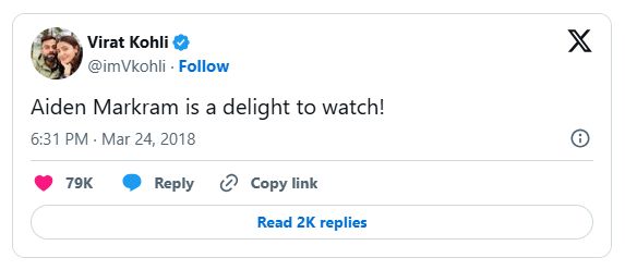 इस बीच, विराट कोहली का एक पुराना ट्वीट वायरल हो गया है जिसमें उन्होंने 2018 में मार्कराम की एक पारी की तारीफ करते हुए लिखा था — “Aiden Markram is a delight to watch!”।